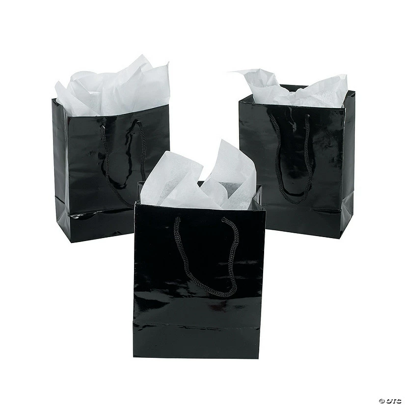 β’ Quality: These stylish gift bags are sure to make your present stand out from the pack. Just add some tissue paper for a beautiful gift presentation!β’ Ready to Gift: With several gift bags on hand, youβll never be caught unprepared when itβs time to wrap a gift again!β’ Reusable: Go green with this eco-friendly gift bag! They could even be reused for future gifts.Give your gifts an elegant appearance with these stylish little bags. They’re wonderful for celebration party favors, small swag and goodies. Fill them with sweet little treats to satisfy your guests! Each glossy-finished paper bag includes rope handles. Paper. 4 1/2″ x 2 1/2″ x 5 3/4″