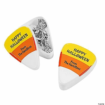 Nobodyโs smelling anyoneโs feet this year for Halloween! These cute candy corn-shaped treat containers are sure to please party guests of all ages and are great for handing out in the office, classroom or at home. Simply add small chocolates (not included) or spooky favors like tattoos and rings (sold separately on this website). Personalize with 4 lines of text. Plastic. 3″ Simple assembly required to apply personalized sticker. ยฉ OTC
